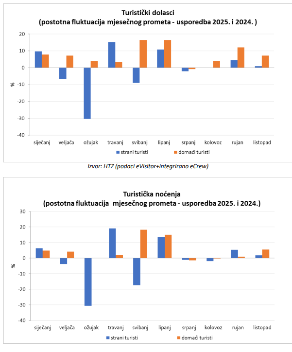 Listopad je s 1,20 mil. dolazaka i 4,06 mil. noćenja značio rast od 2%. Bio je, kao i uvijek, mjesec profesionalaca i komercijalnog turizma, pa su hoteli na 1,9 milijuna, domaćinstva na 860 tisuća, kampovi su povukli dobrih 450 tisuća, a nautika 300 tisuća. Osim drastičnog pada Francuza, nastavljen je blagi pad Nijemaca, vidljiv je nešto jači porast Britanaca, dok je sve ostalo bilo u rastu.